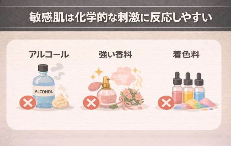 敏感肌は化学的な刺激に反応しやすいため、以下の成分は極力避けるようにしましょう。