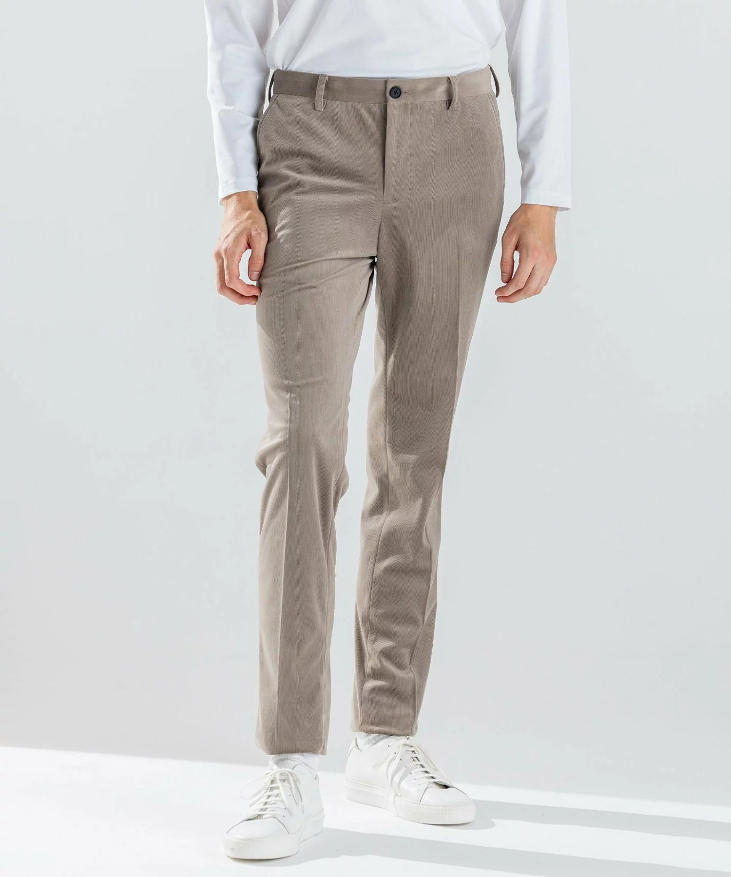 トリコット機で編まれたコーデュロイはストレッチ性が高く毛が抜けないうえ、抜群の肌触りが味わえます。ピッチの細いコーデュロイパンツは、光沢がありしなやかな見た目で、カジュアルにもドレッシーな着こなしにも使いまわせます。