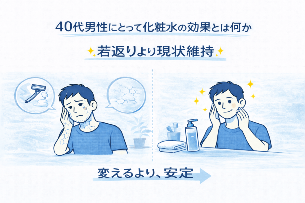 化粧水というと、「肌をきれいにする」「若返る」といったイメージを持たれがちですが、40代男性にとっての役割は少し違います。この年代で化粧水に求めるべきなのは、肌を大きく変えることではなく、これ以上悪く見せないために状態を安定させることです。年齢を重ねた肌は、乾燥やひげ剃り、生活リズムの乱れによって、放っておくだけで疲れた印象が出やすくなります。