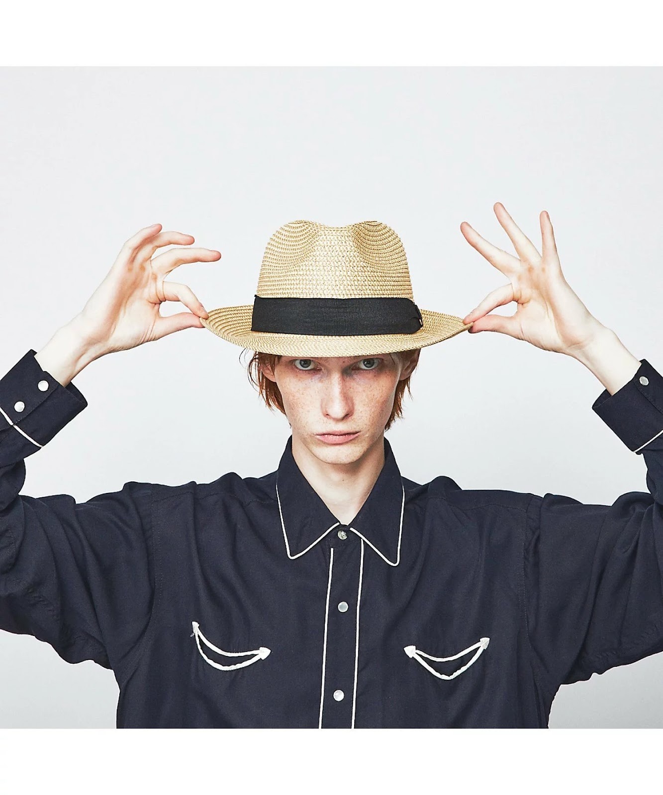 浅めにかぶって少し後ろへ傾けるとこなれた印象を演出できるうえ、 顔に影ができにくくなり、爽やかな印象に。また、前髪のセットが崩れにくくなります。