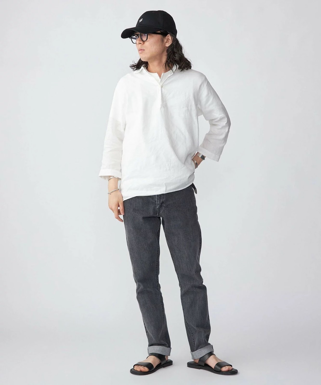 七分袖にロールアップしたデニムパンツ、そして足元はサンダルの爽やかなコーディネートには、シンプルなキャップがお似合い。ツバが長く浅めのベースボールキャップを選ぶとこなれ感が出て、シンプルなのにおしゃれ度が増します。