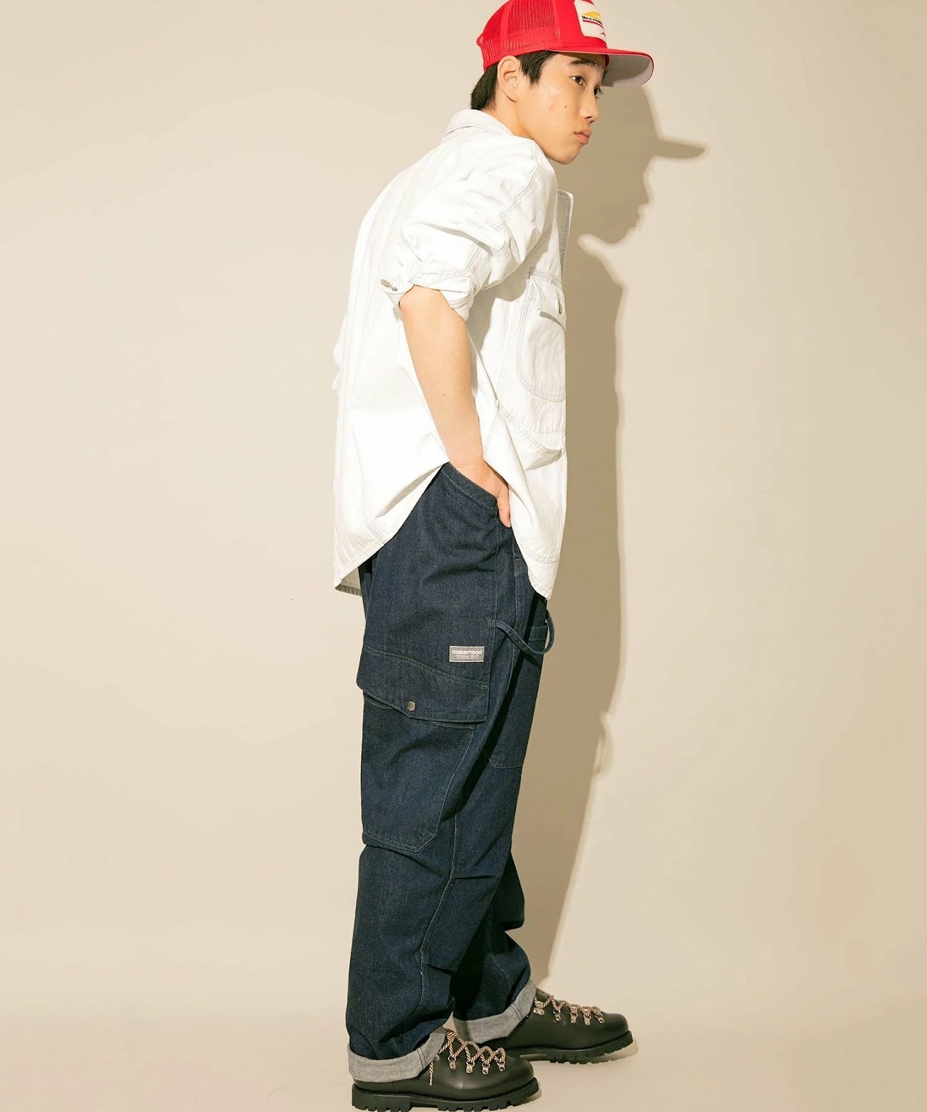 白シャツ&ワークパンツのカジュアルスタイルには、明るい色の深めベースボールキャップをプラス。コーデのワンポイントとして存在感を放っていて、一気におしゃれに見えます。