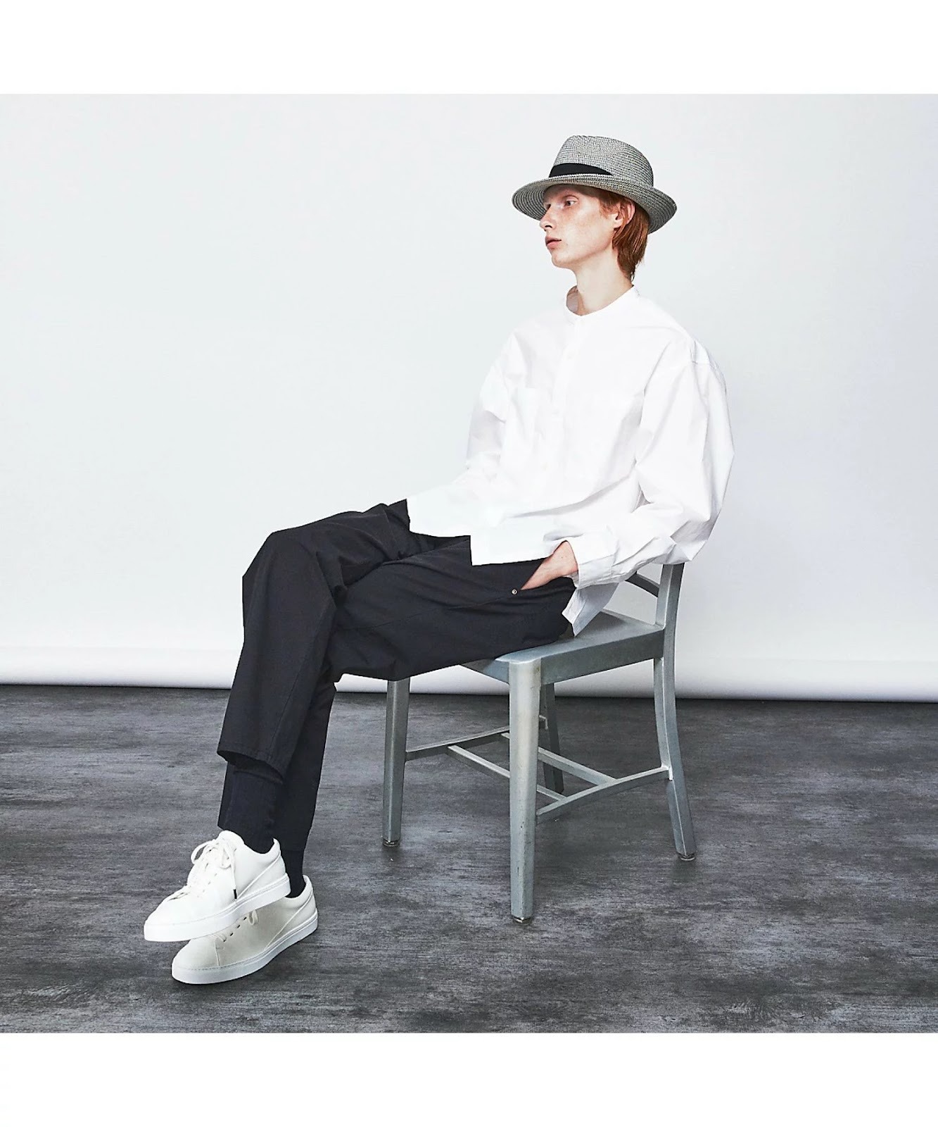 シンプルなモノトーンコーデには、個性的な中折れハットをプラスすることで、お互いの良さが引き立ちます。