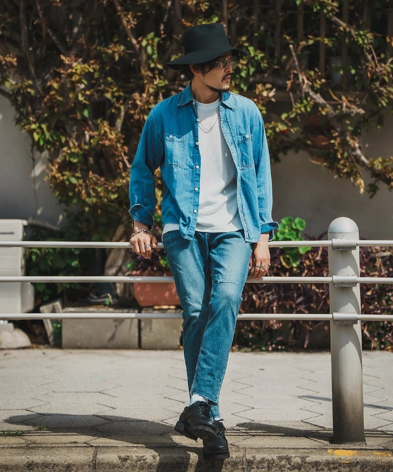 デニムセットアップに、ツバが長くクラウンが深めのハットを合わせると、大人カジュアルの出来上がり。