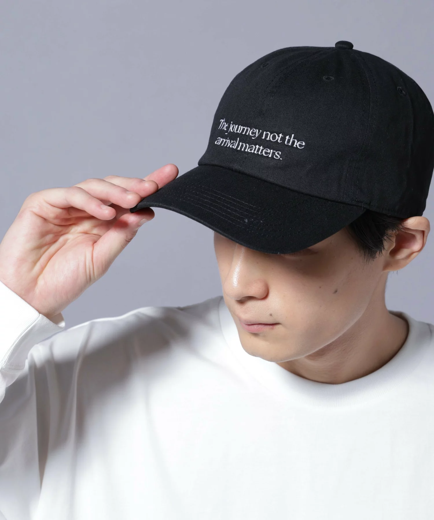 面長に似合うキャップは、顔の縦幅をカバーする、深めに被れるものやツバが長めのデザインです。そして、つばを前に出すようにかぶり、目線を下げるとさらにバランスよく見えます。