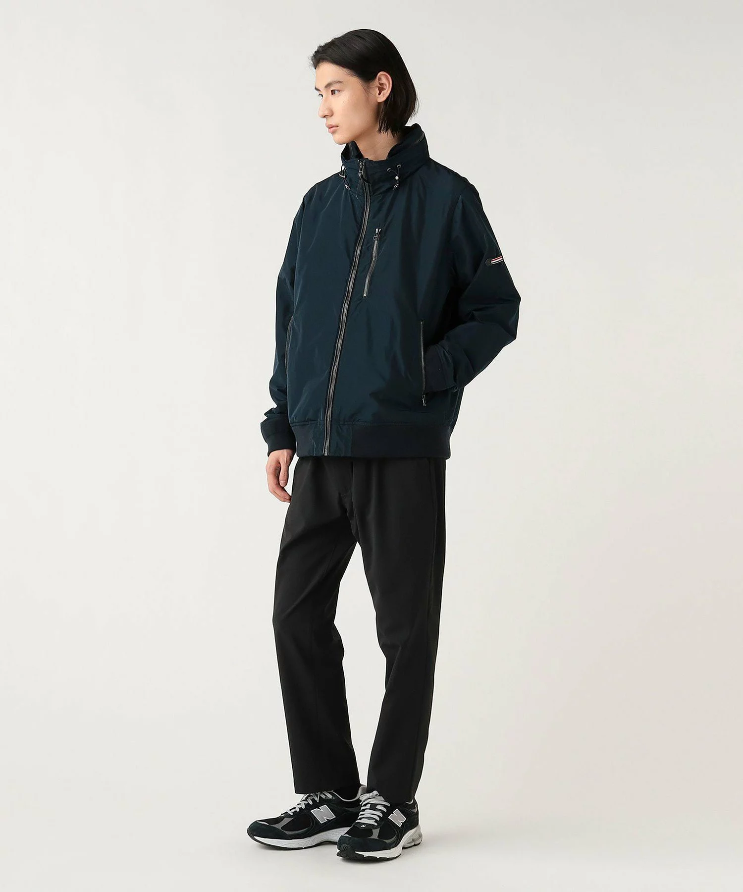 インナーを選ばないシンプルデザインですが、襟付きブルゾンに襟付きシャツを重ねるのがおしゃれ上級者。首元がかさばる際には、ぜひバンドカラーのシャツを選んでみてください。