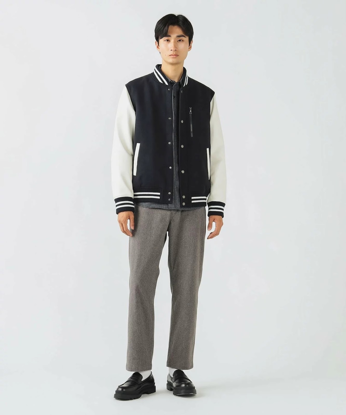 デニムでなくても、きれいめパンツとローファーを合わせればアメカジスタイルを楽しめます。1枚ですでに存在感のあるスタジャンだからこそ、合わせるアイテムはシンプルなデザインを選びましょう。
