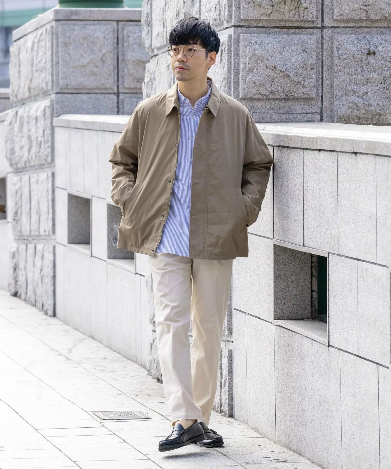 実際にブルゾンを取り入れたコーディネートを見てみましょう。ブルゾンというアイテムでも種類はさまざまで、選ぶデザインや素材で印象は大きく異なります。